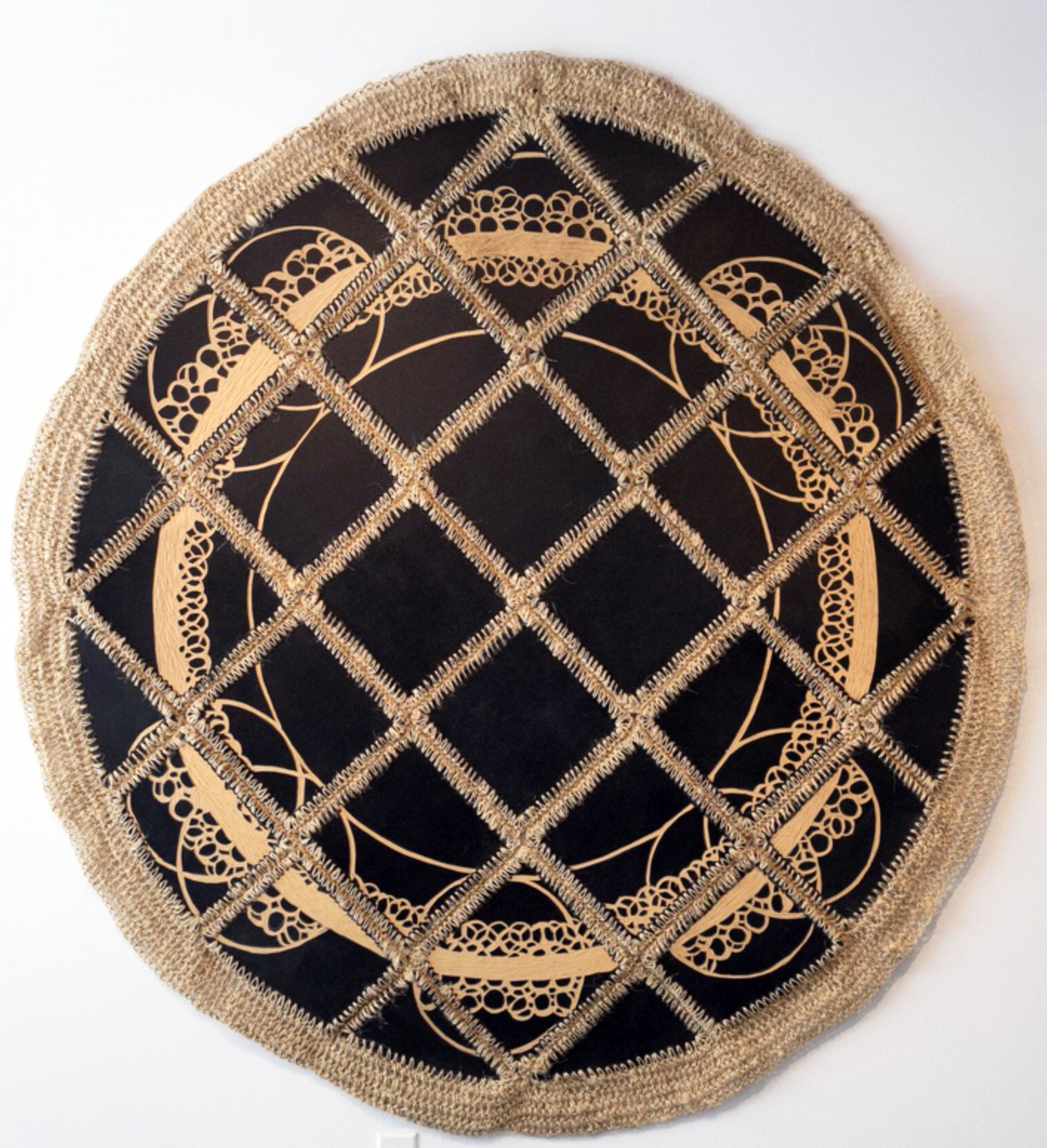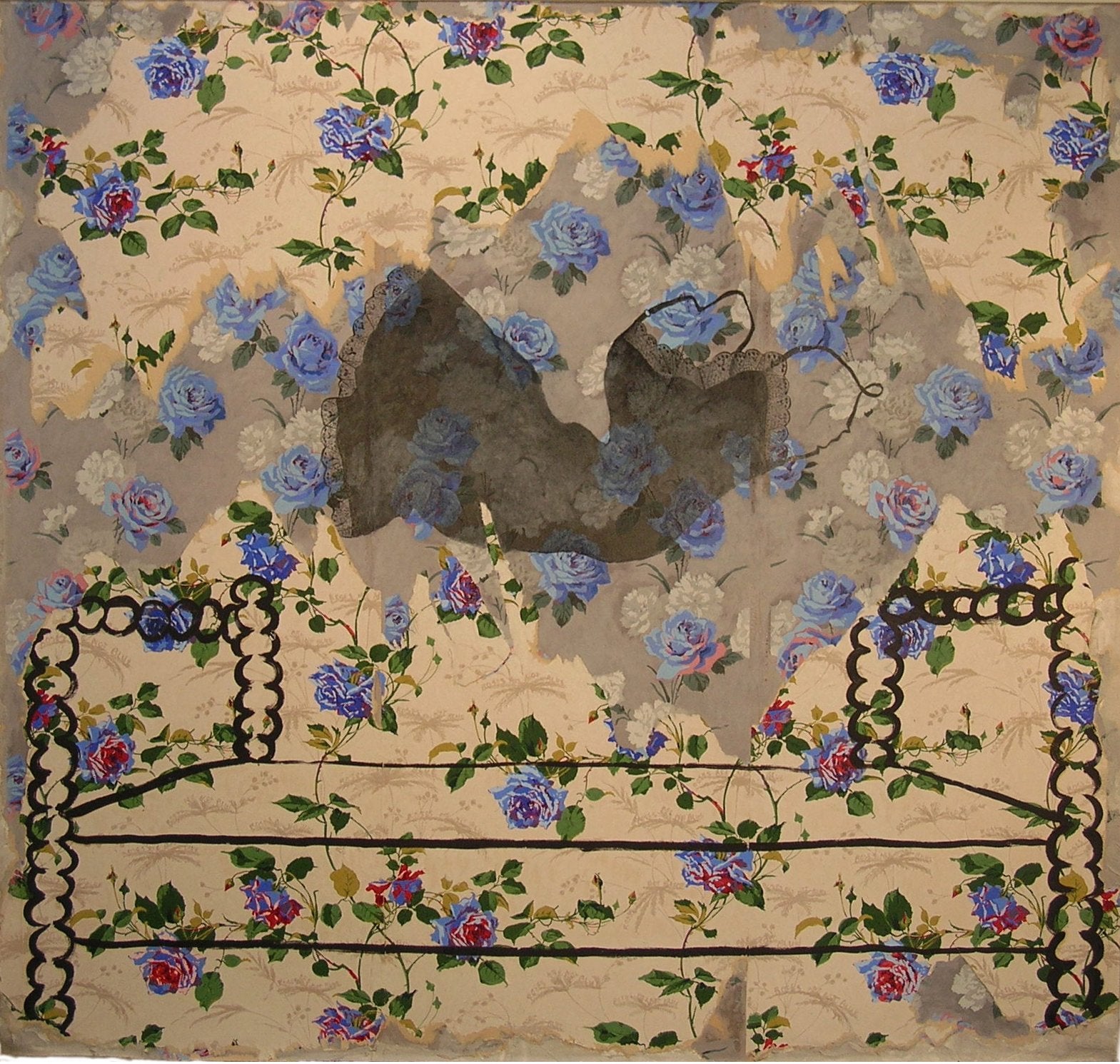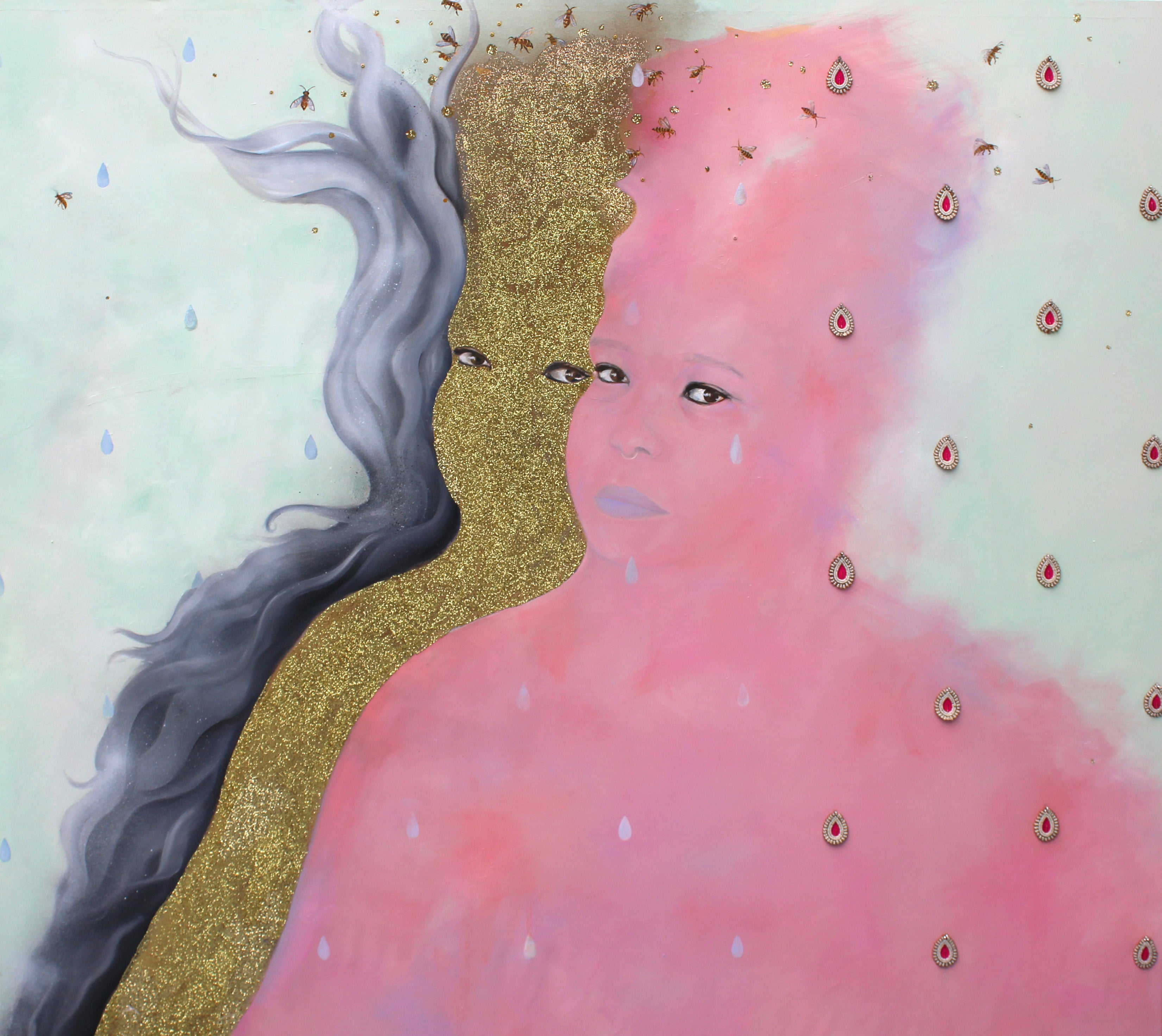 Oil paint, glitter, appliques, gold leaf, spray paint on canvas