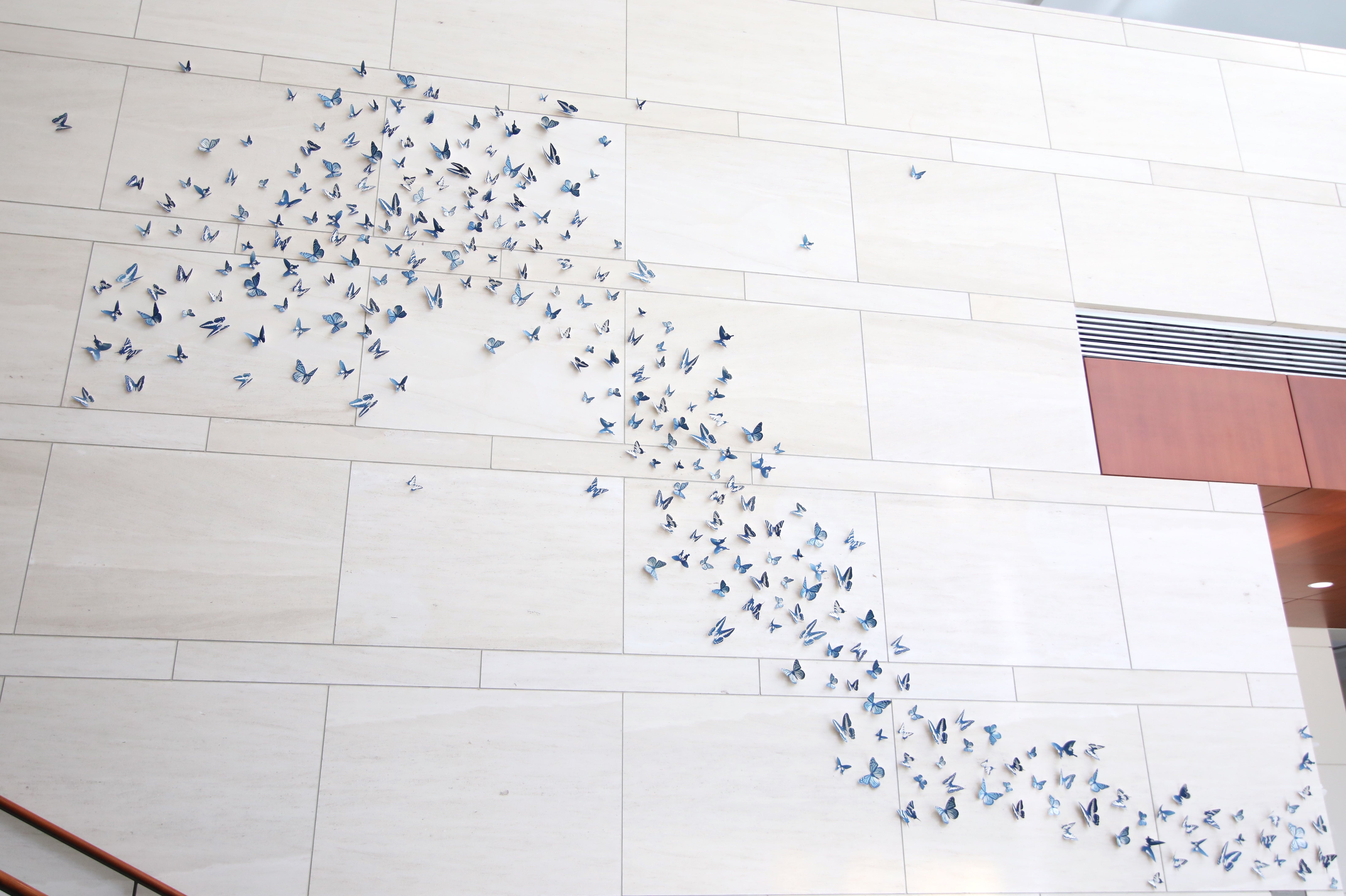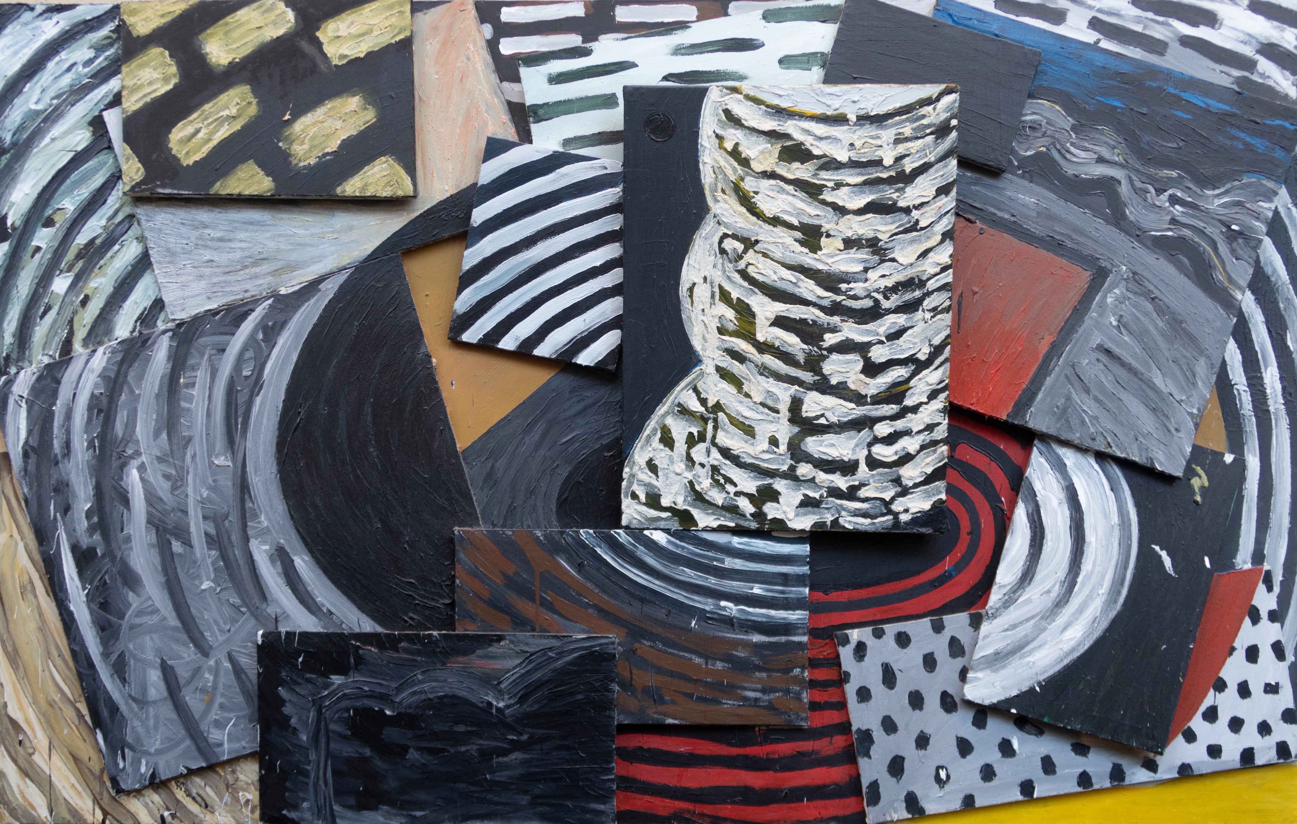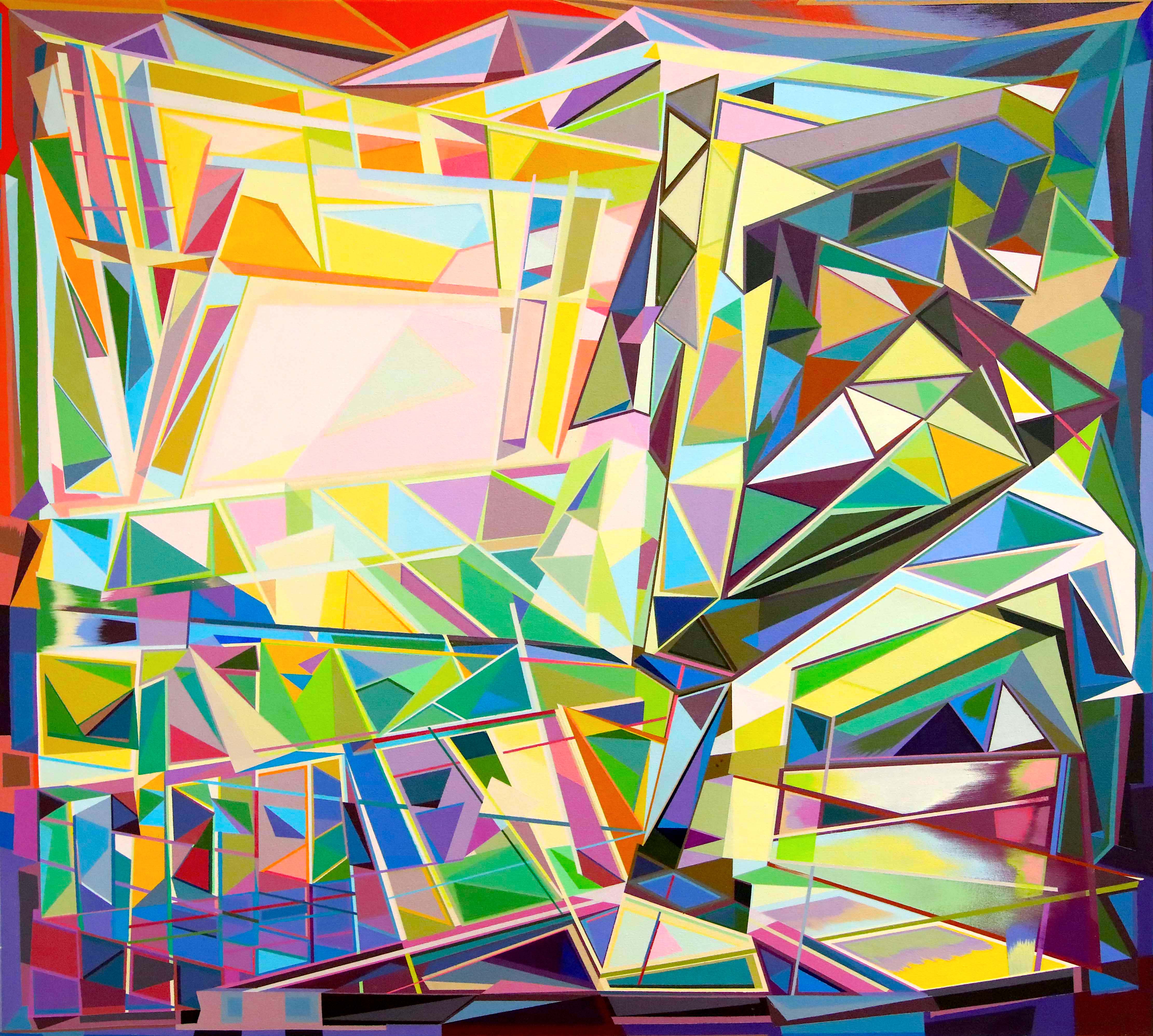 Oil paint, glitter, appliques, gold leaf, spray paint on canvas