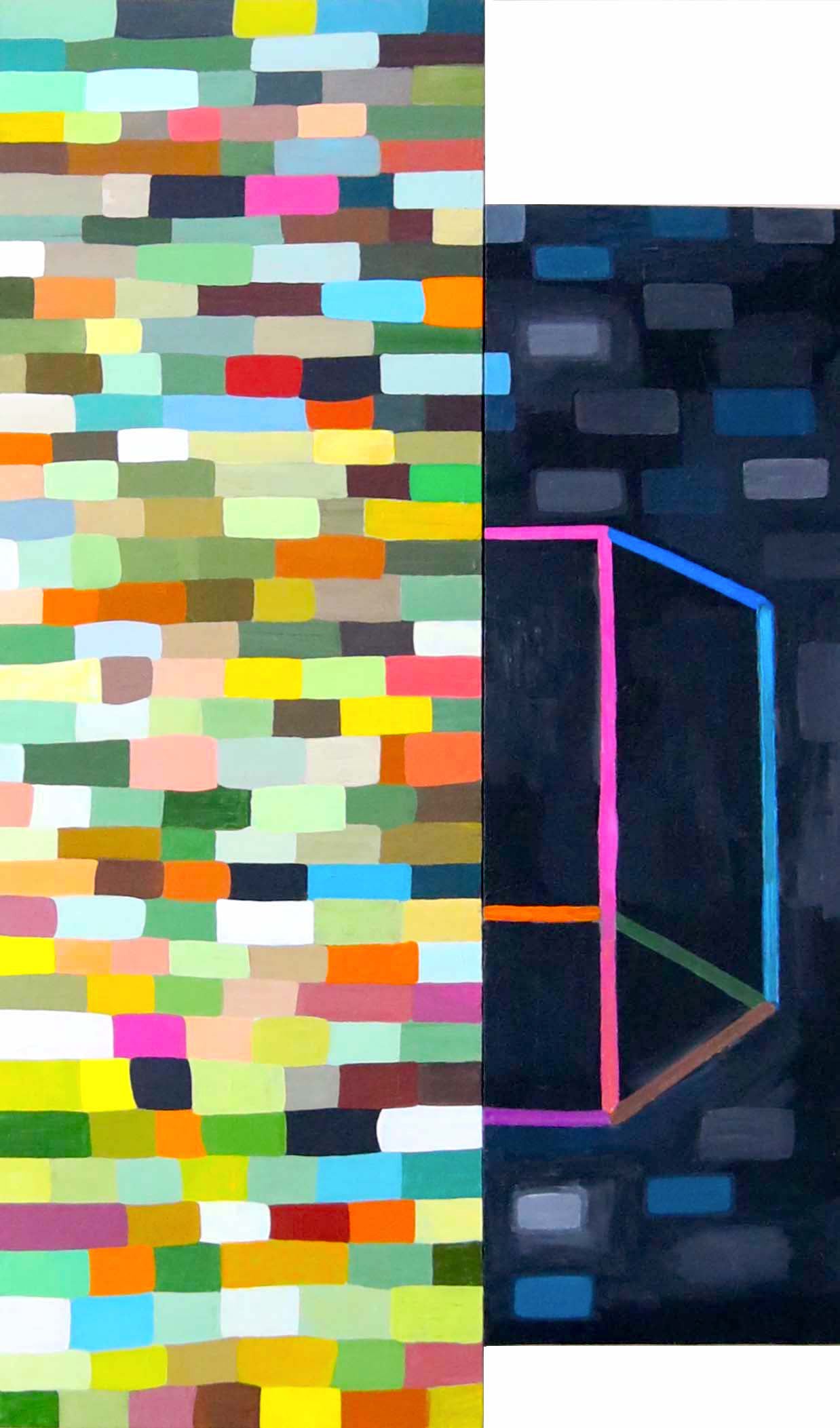 In her mixed-media paintings, she portrays her subjects in imaginative representations of barzakh—magical and full of possibility. They look back at the viewer, emerging from and blending with dreamscapes adorned with glitter, rhinestones, and beads—symbols of their queer and diasporic heritages. Her portraits celebrate the in-between and those who occupy it, exploring the rich spaces beyond binaries.