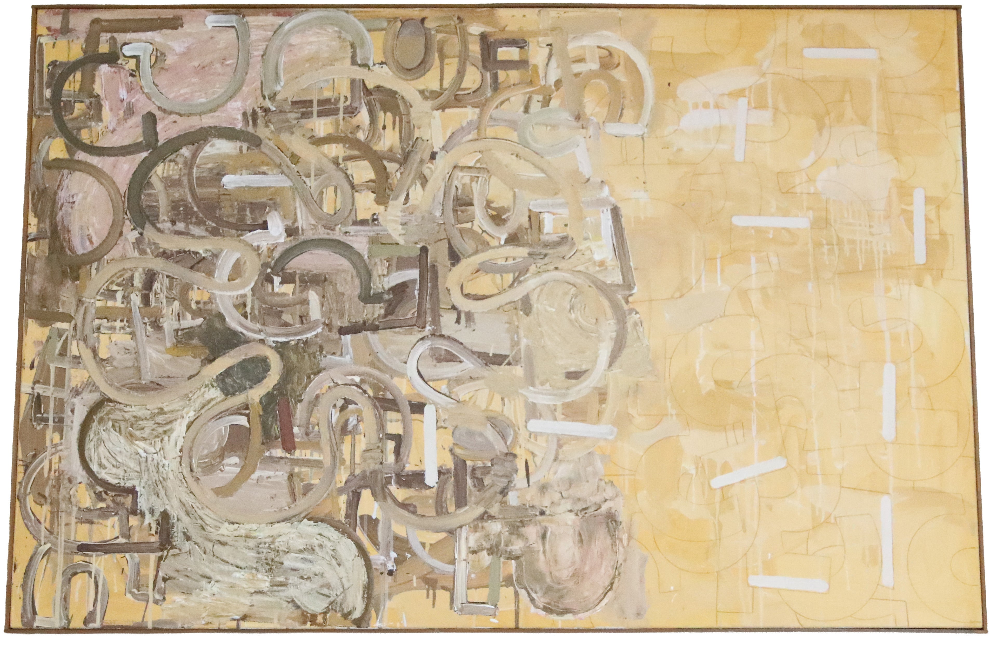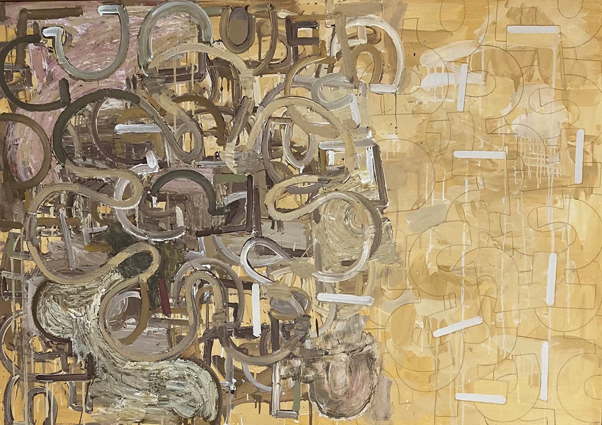 Oil paint, glitter, appliques, gold leaf, spray paint on canvas